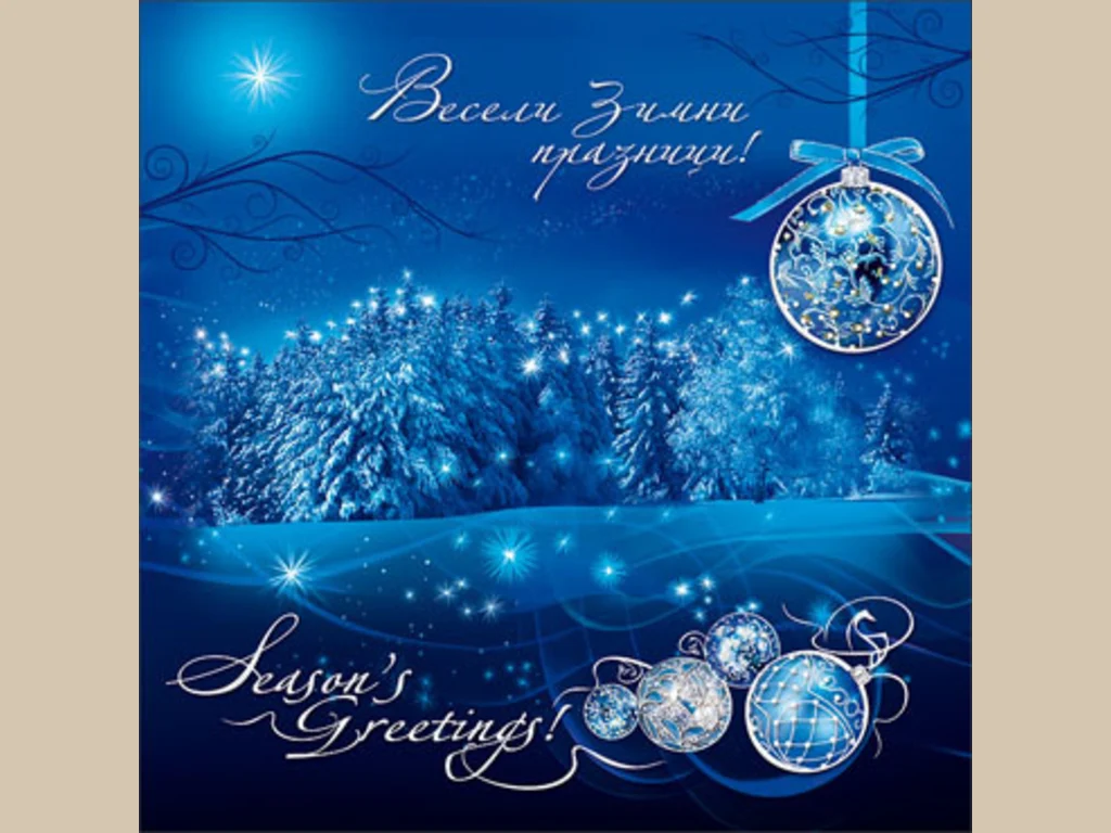 Ключови фрази: Синя зимна картичка светещи звездички борове отрупани сняг коледна украса пожелания поздрави