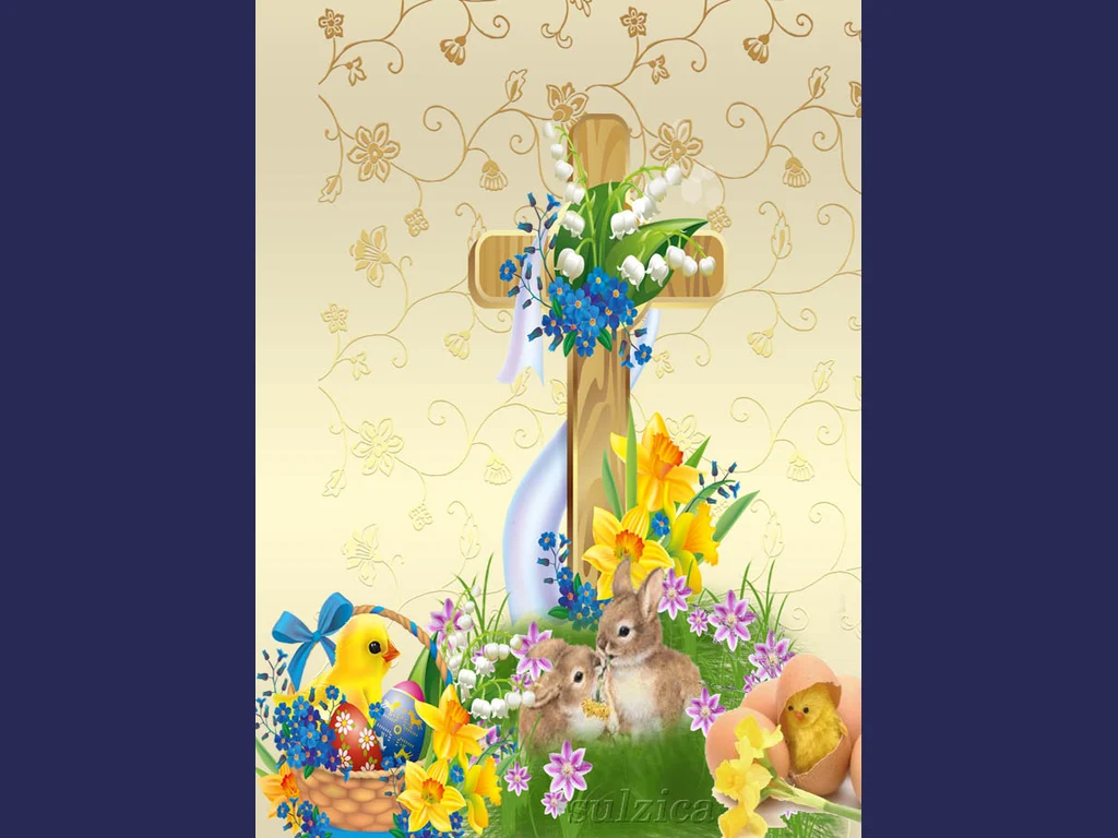 Ключови фрази: пиленца зайчета нарциси моменасълза синчец шарени велигденски яйца кръст мъртвите въскресение зелена трева цветя кошничка панделка
