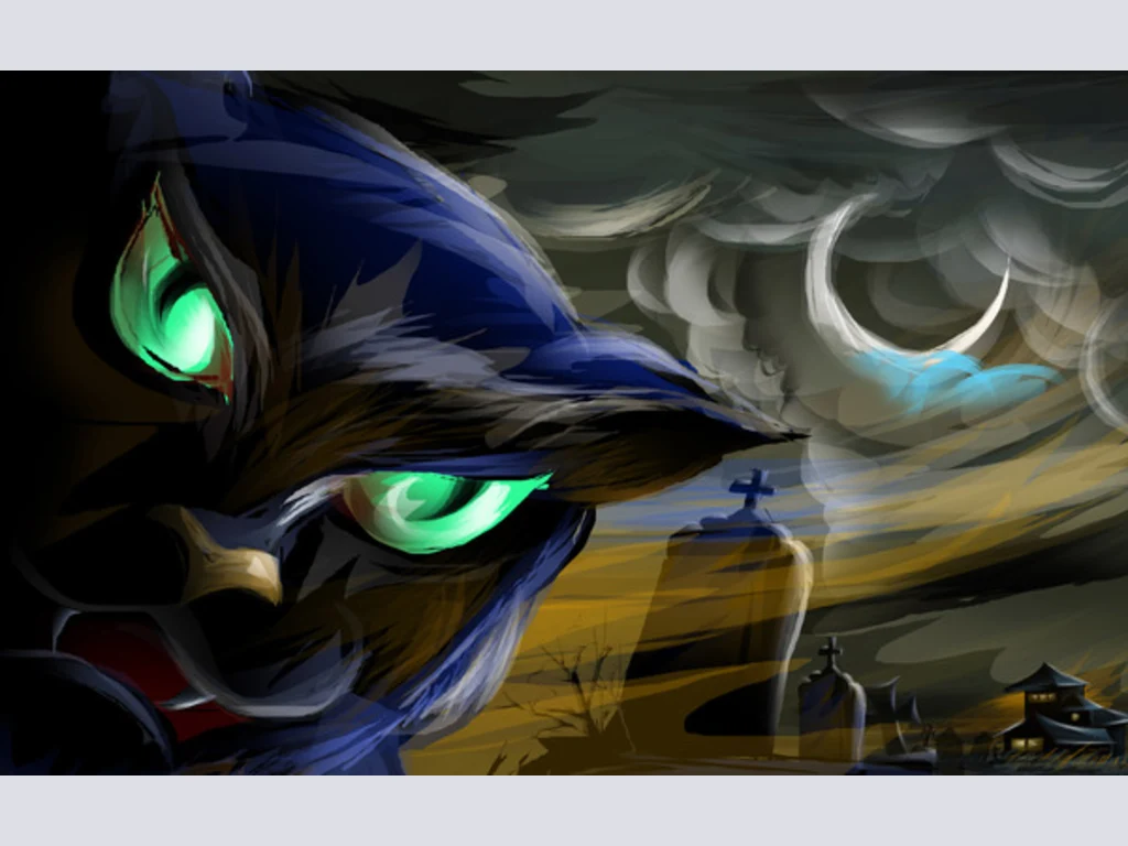 Ключови фрази: Картичка рисувана пожелание поздрави весел празник прилепи гробища страшен черен зловещ котарак замък тикви призрачна качулка нощ Хелоуин