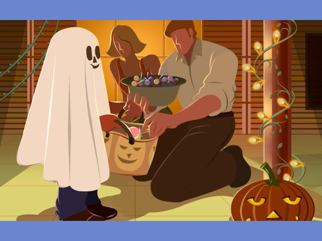 Ключови фрази: Картичка хелоин деца маскирани духчета получават бисквитки бонбони лакомства семейства традиция повелява светеща тиква лампички