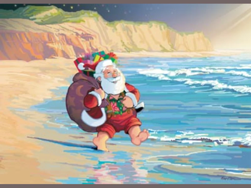 Ключови фрази: Дядо Коледа картичка бряг океан чувал подаръци изненада любов скеч забавна смешна комикс рисувана