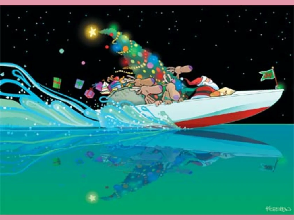Ключови фрази: Дядо Коледа скутер лодка синя чиста вода весело забавление луна звезди чудна нощ картичка елени скеч забавна смешна комикс рисувана