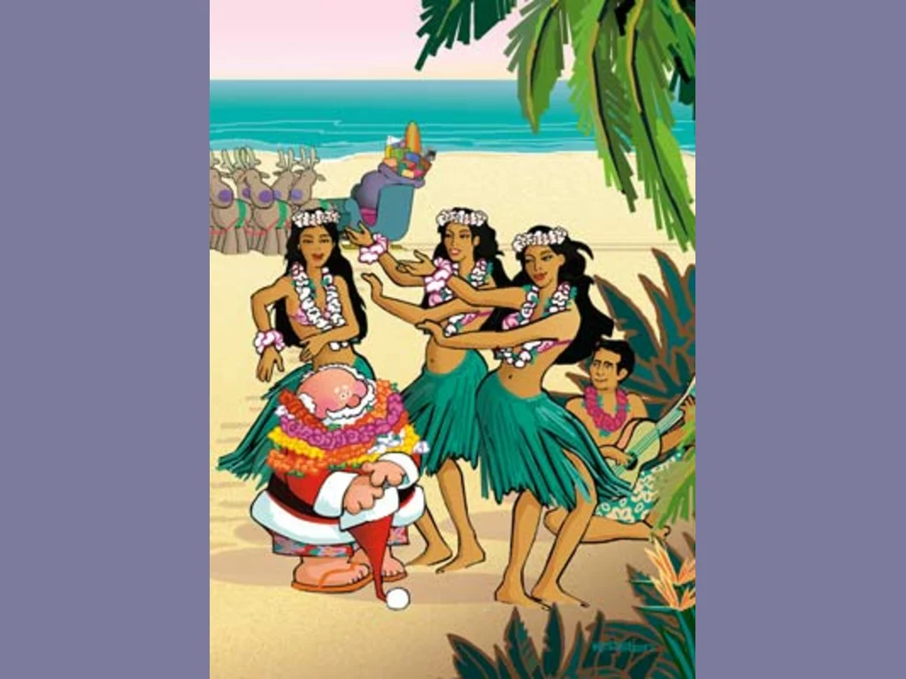 Ключови фрази: Дядо Коледа картичка елени еленчета шейна скеч забавна смешна комикс рисувана остров танцуващи таитянки палми лагуна пясък вода бряг китара