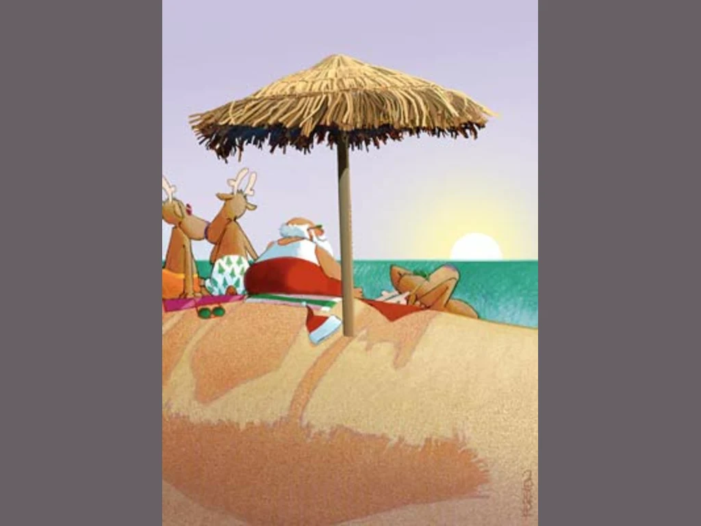 Ключови фрази: Дядо Коледа плаж пясък вода почивка щастие пожелания поздрави картичка елени еленчета шейна скеч забавна смешна комикс рисувана