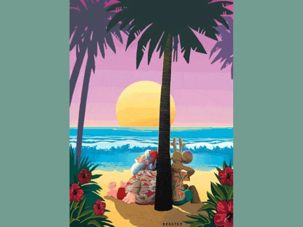 Ключови фрази: Дядо Коледа картичка елени изгрев палми океан вълни цветя красота екзотична картина скеч забавна смешна комикс рисувана