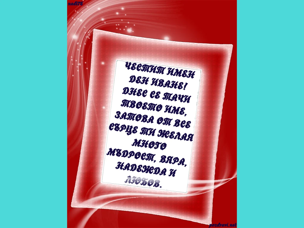 Ключови фрази: Картичк поздрави честит имен ден Иване пожелание цяла година весел засмян любовна магия здраве късмет успехи мечти щастие мъдрост вяра надежда приятел стар