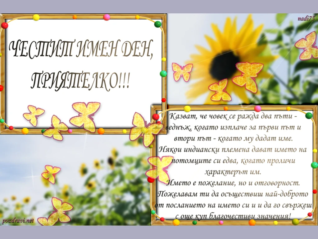 Казват, че човек се ражда два пъти - веднъж, когато изплаче за първи път и втори път - когато му дадат име. Някои индиански племена дават името на потомците си едва, когато проличи характерът им. Името е пожелание, но и отговорност. Пожелавам ти да осъществиш най-доброто от посланието на името си и и да го свържеш с още куп благочестиви значения! Честит имен ден!