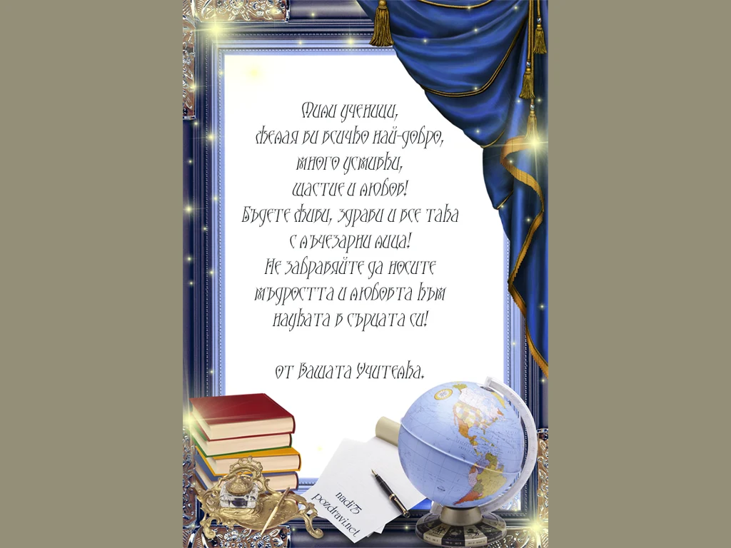Картичка с пожелание от учителка към нейните ученици.