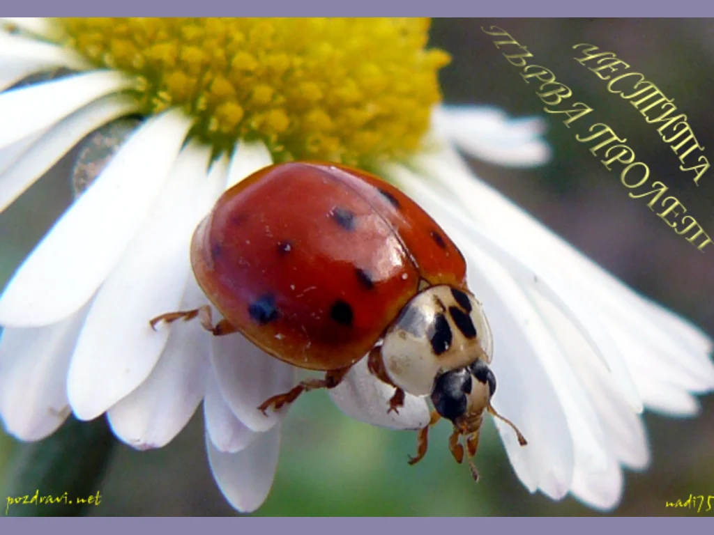 Ключови фрази: Честита първа пролет картичка калинка маргаритка разцъфтяла пожелание поздрави празник красота ражда нов живот