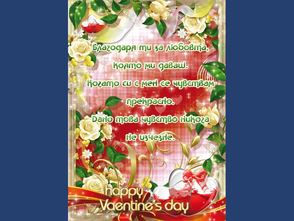 Ключови фрази: Картичка пожелания поздрави празник панделки букет звездички сърца влюбени изящни рози Свети Валентин