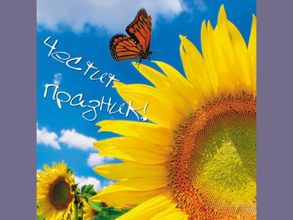Ключови фрази: Осми декември синьо небе пеперуда слънчоглед честит празник надпис