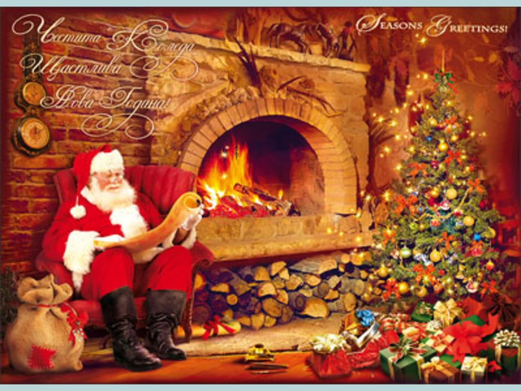 Ключови фрази: Поздрави щастливи зимни празници огън камина жарава любов плам свещички горящи пожелание щастие радост мир котенце домашен любимец коледна елха украса звезда луна играчки