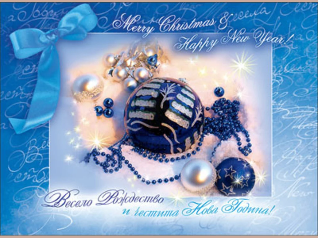 Ключови фрази: Картичка пожелание поздрави синя панделка украса новогодишна коледна перлички играчки звездички светещи