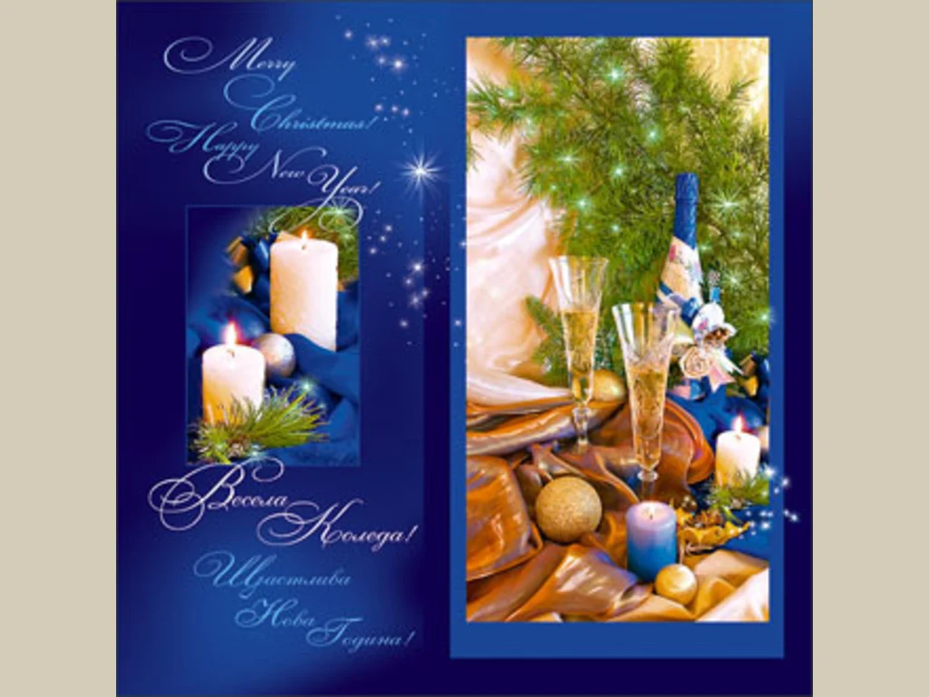 Ключови фрази: Картичка синьо интимна две горящи свещи чаши пълни шампанско бутилка празник борови клонки коледни звездички новогодишни пожелания любов щастие поздрави