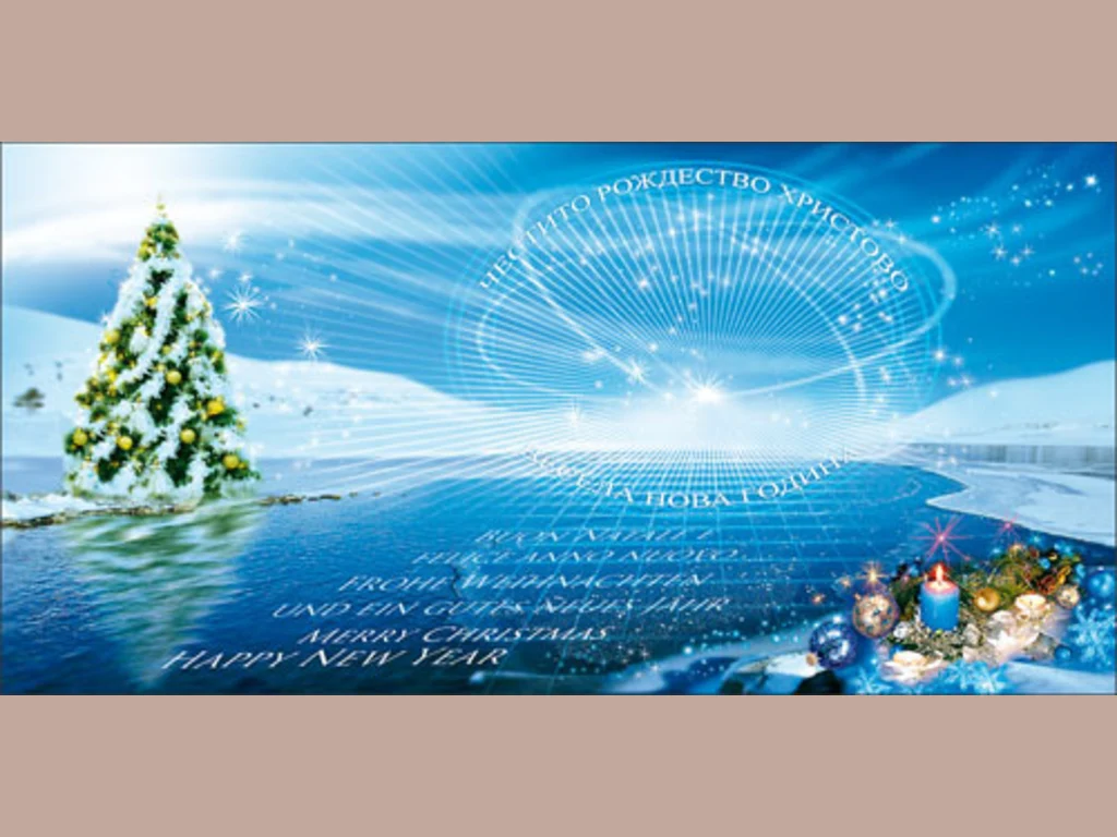 Ключови фрази: Красива зимна картичка украсена коледна елха запалена свещичка новогодишни играчки океан зимен пейзаж звездички