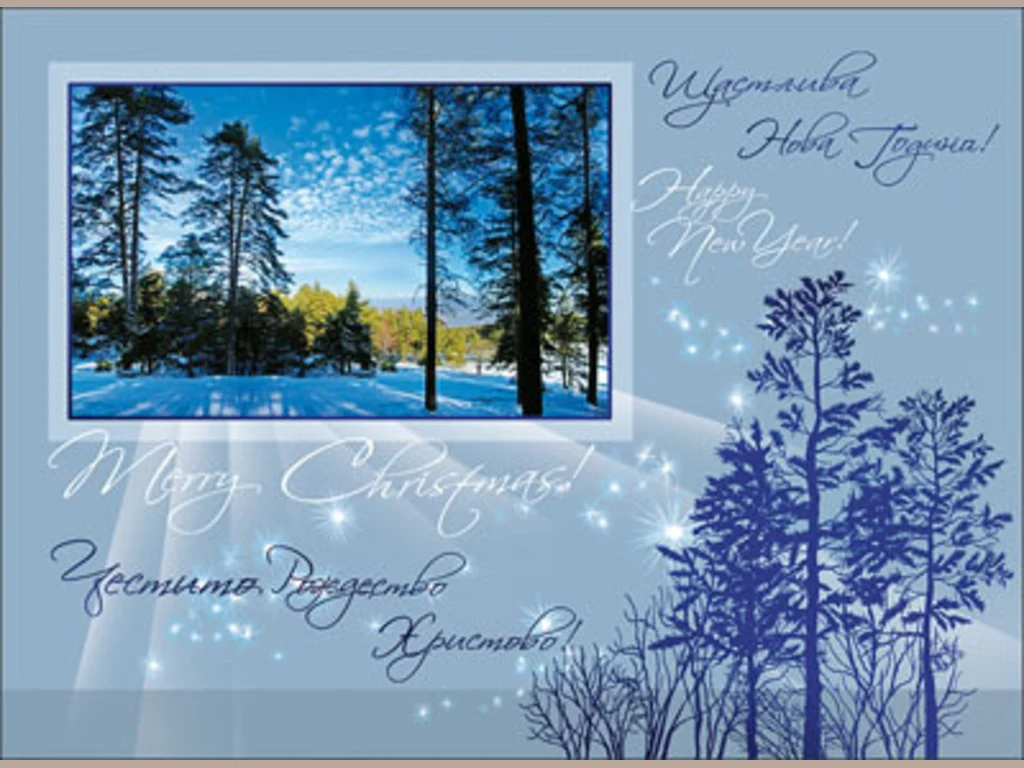 Ключови фрази: Картичка зимна синьо сияние звезди гора натрупал сняг пожелание здраве любов поздрави приятели успехи