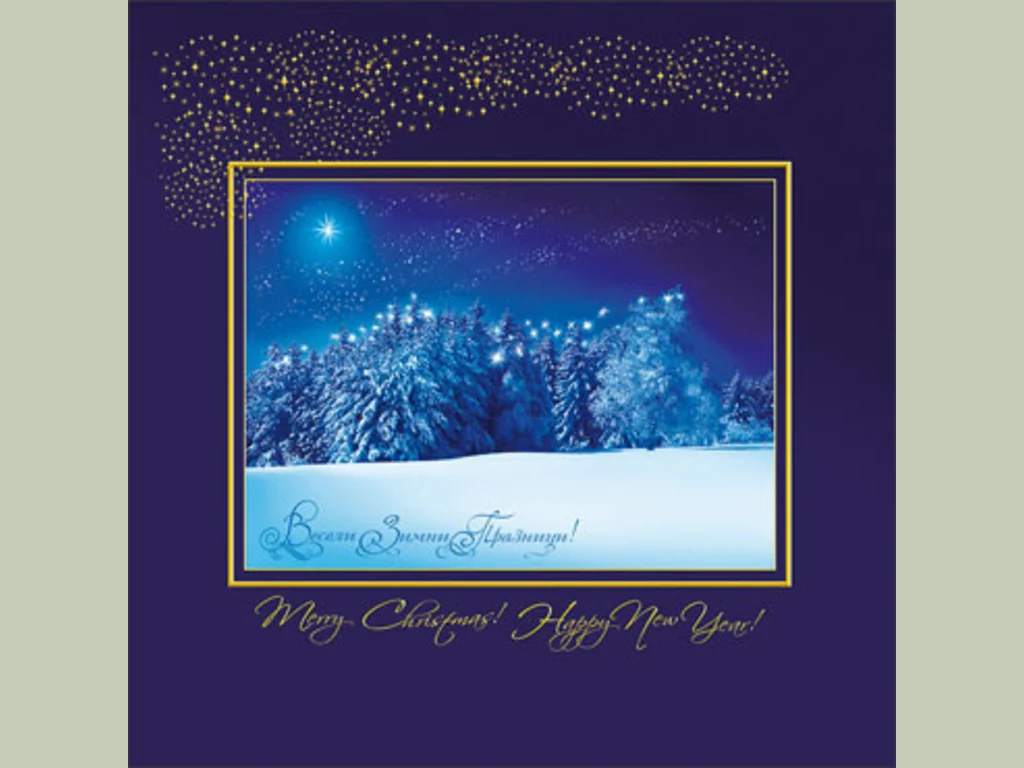 Ключови фрази: Картичка зимна синьо сияние звезди гора натрупал сняг пожелание здраве любов поздрави приятели успехи