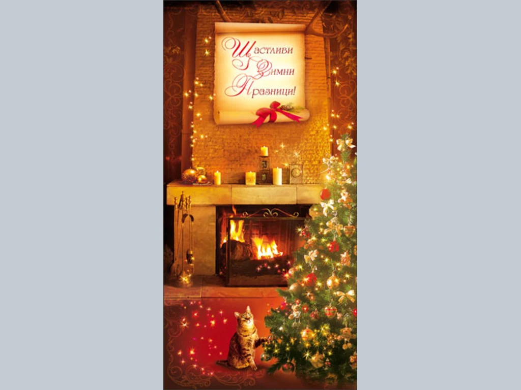 Ключови фрази: Поздрави щастливи зимни празници огън камина жарава любов плам свещички горящи пожелание щастие радост мир котенце домашен любимец коледна елха украса