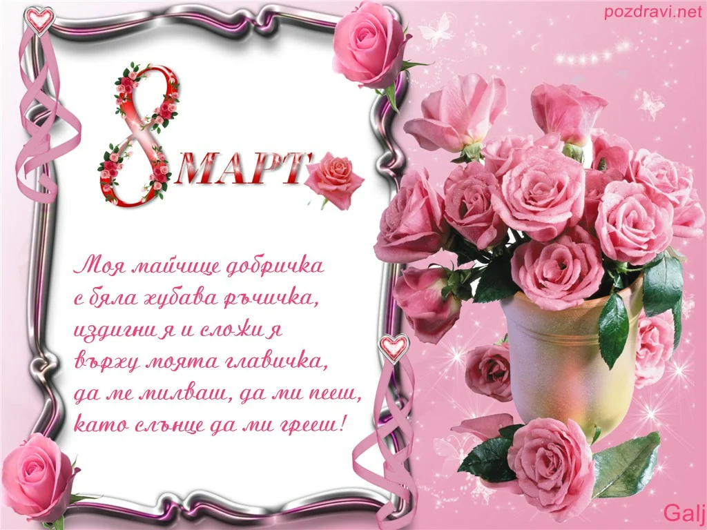 Ключови фрази: Картичка мама честит осми март ваза букет цветя разцъфнали рози моя майчице любима поздрави пожелание празник