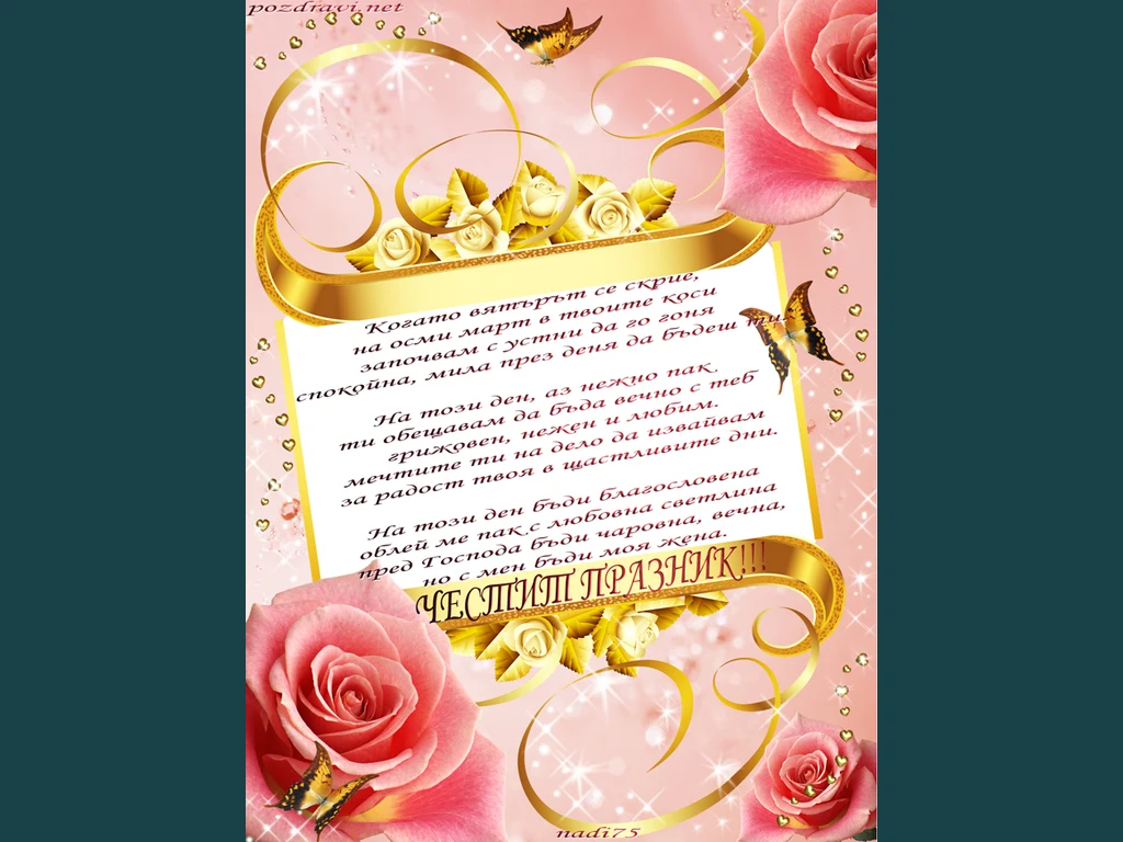 Ключови фрази: Картичка пожелание поздрави празник осми март красива щастлива благословена усмихната радостна букет разцъфнали розови рози пеперуди панделка воал диаманти скъпоценни камъни бижута злато красота любов