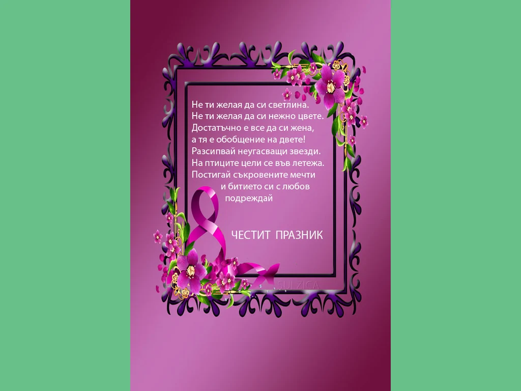Ключови фрази: Картичка лилаво рози панделки букет сияйна красива влюбена живот майка съпруга жена пожелание поздрави празник осми март