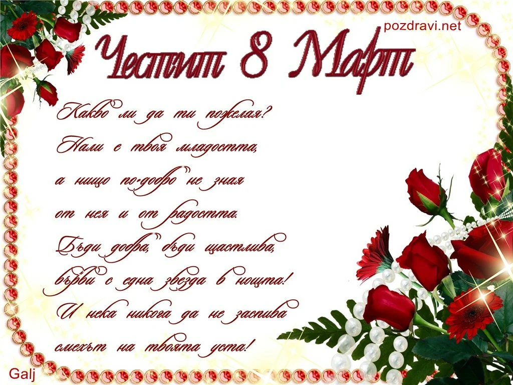 Ключови фрази: Картичка пожелание поздрави празник осми март красива щастлива благословена усмихната радостна букет разцъфнали рози перли панделка воал диаманти скъпоценни камъни бижута злато красота любов