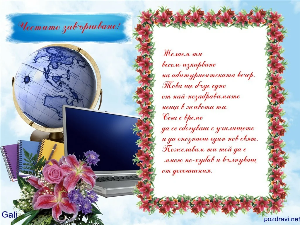 Ключови фрази: пожелание завършване за абитуриент 12 клас абитуриентската вечер глобус лаптоп