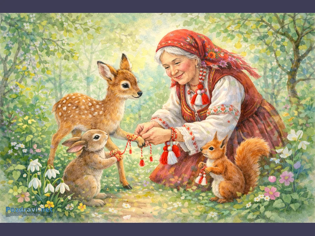 Ключови фрази: Баба Марта, мартеници, сърна, зайче, пролетна гора, детска картичка, български традиции