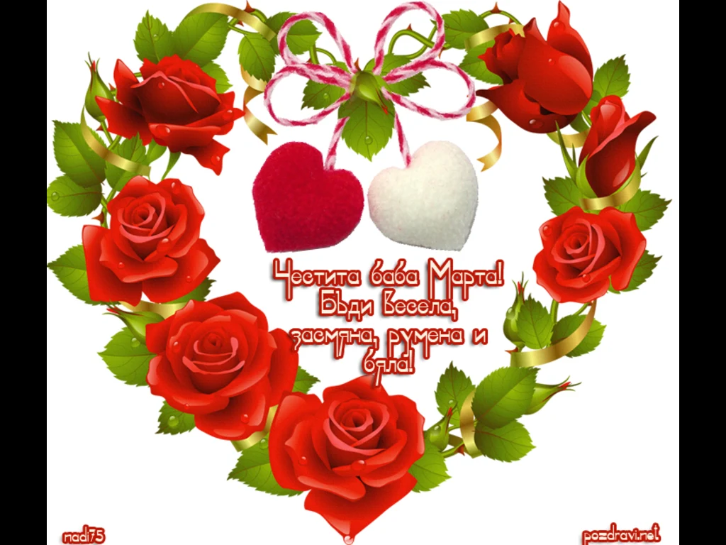 Ключови фрази: Картичка празник Баба Марта бяло червено венец форма сърце пожелание жена поздрави пожелание разцъфнали рози