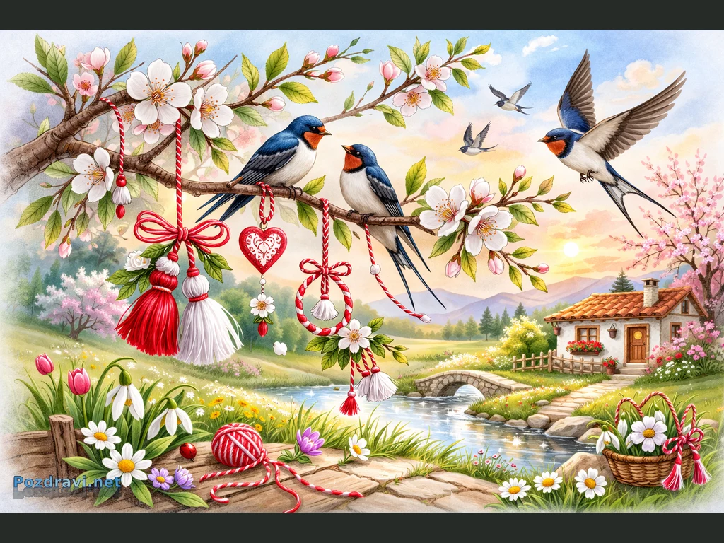 Нежна пролетна сцена с лястовици, зелени клонки и висящи мартеници, подходяща за по-романтична картичка.