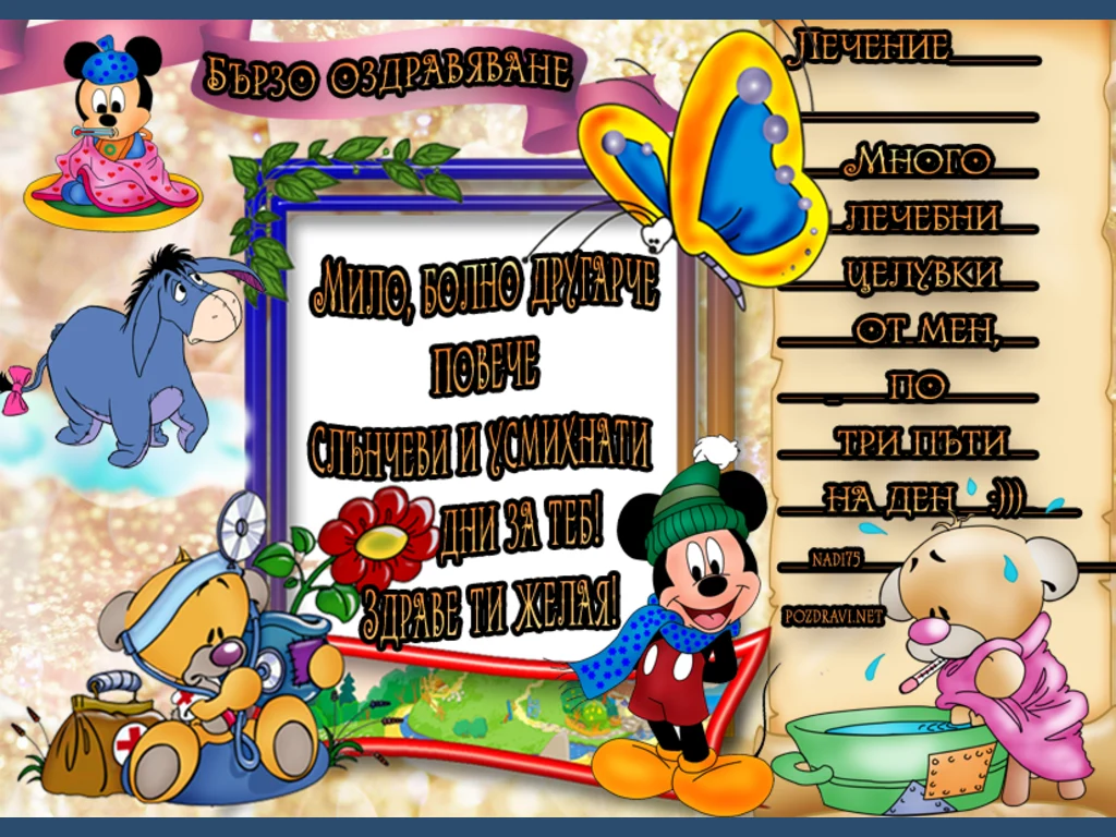 Мило, болно другарче повече слънчеви и усмихнати дни за теб!Здраве ти желая!