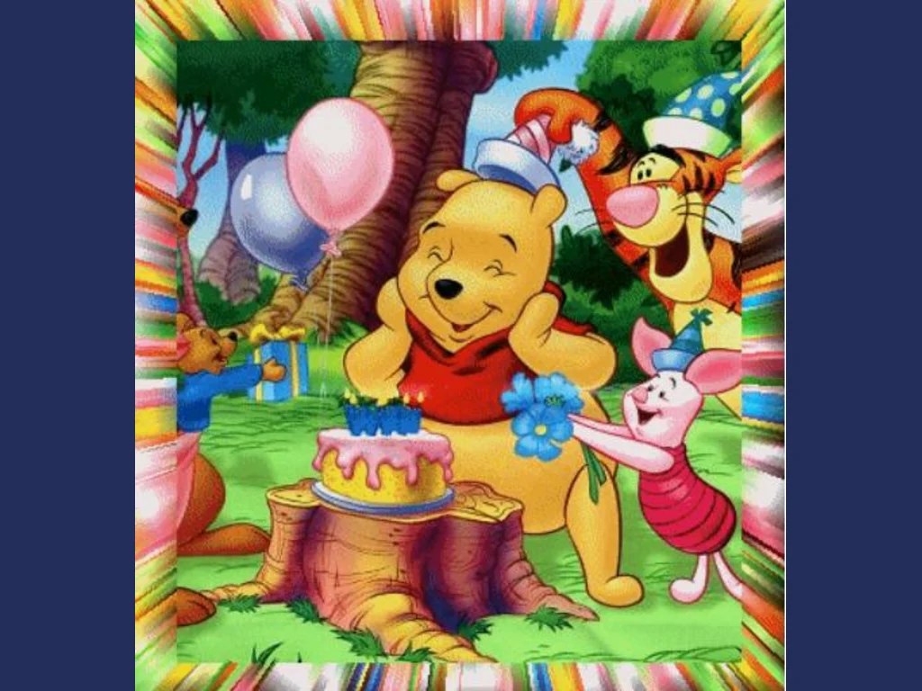 Поздрави за рожденици. Пожелания за рожден ден. Картичка с Мечо Пух. С ефектна рамкаМило сладурче, честит рожден ден!