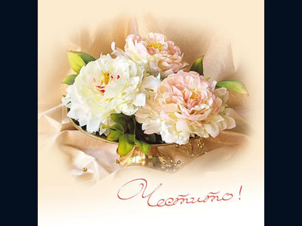 Ключови фрази: Букет бял божур картичка цветя пожелание честито поздрави любов късмет щастие
