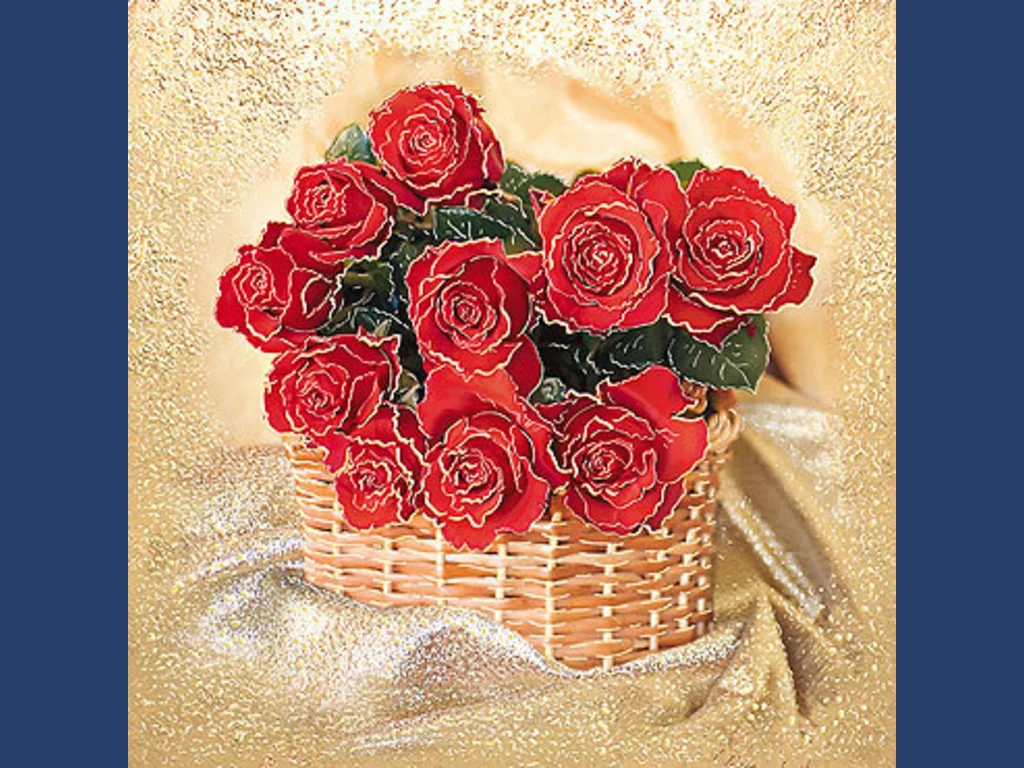 Ключови фрази: Картичка поздрави пожелания пълна кошница алено червени рози елегантен празничен свадбен сатен юбилей