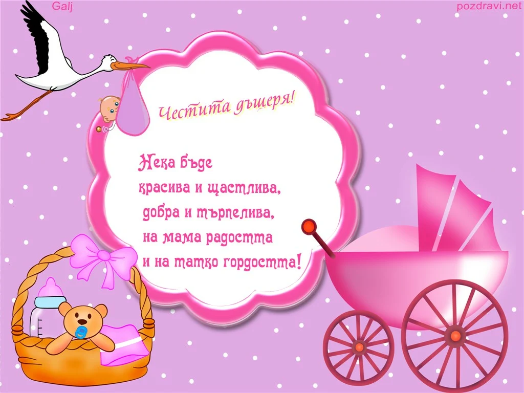 Ключови фрази: Честита дъщеря донесена щъркел поздрав новородено момиче бебешка количка кошничка мече биберон шише розова панделка звездички радост щастие любов живот