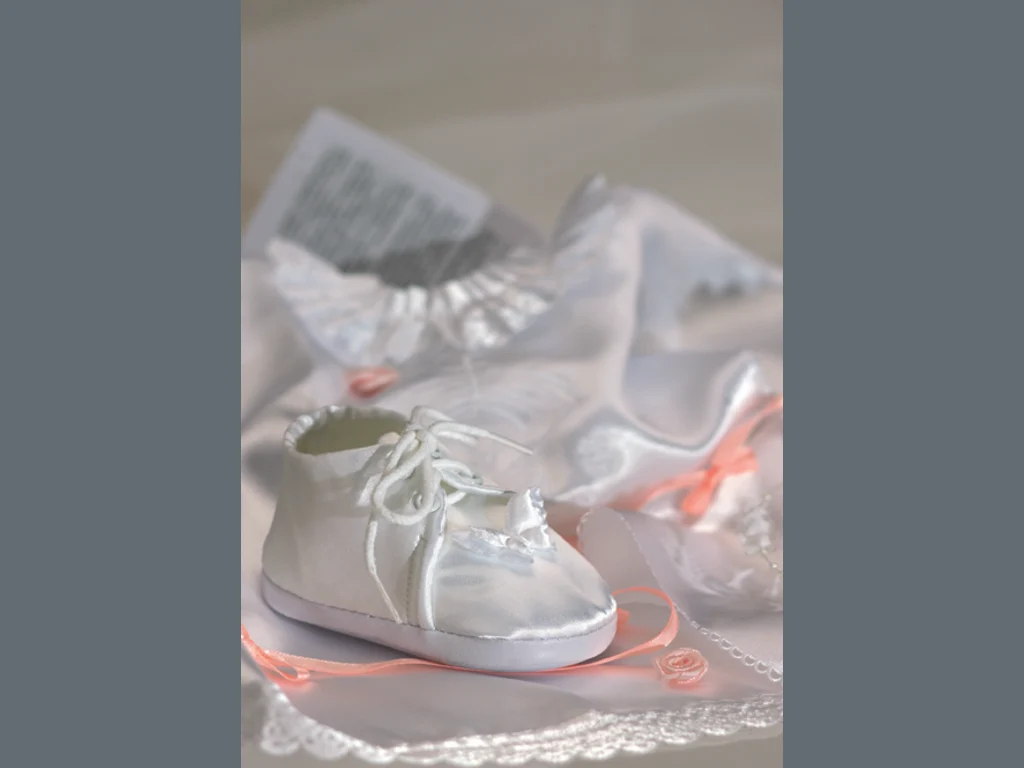 Ключови фрази: Честито Бебе картичка подходяща кръщене бели сатенени празнични дрешки буйки розички розови красота пожелание поздрави любов благословение