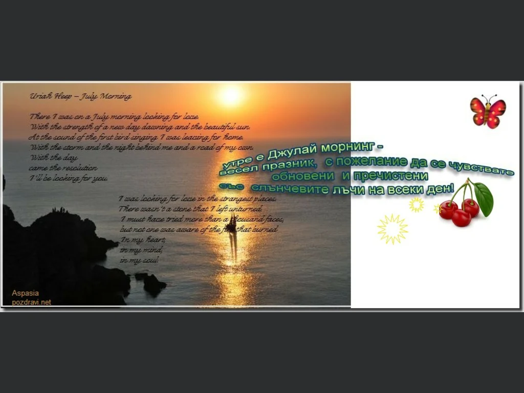 Мнозина вече са на морския бряг да посрещнат там утрото на 1 юли и да отбележат станалия традиционен Джулай, наречен така заради култовото парче 'Джулай морнинг' (July Morning) на 'Юрая хийп' (Uriah Heep). Това е десетминутна песен, съставена от различни идеи на Кен Хенсли и Дейвид Байрън. Докато записват Look at Yourself, членовете на групата открили, че имат три различни части от композиции, всички в До-минор, така че опитали да ги сглобят заедно, в резултат на което създават July Morning......