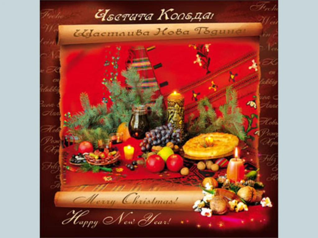 Ключови фрази: Картичка празнична коледна постни ястия трапеза погача свещ огън пламъче борови клонки поздрави пожелание