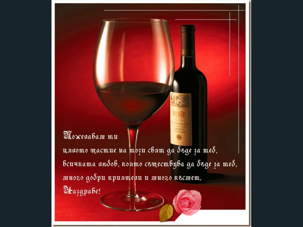 Ключови фрази: Картичка бутилка вино чаша добри приятели поздрави пожелание роза щастие свят любов късмет наздравица