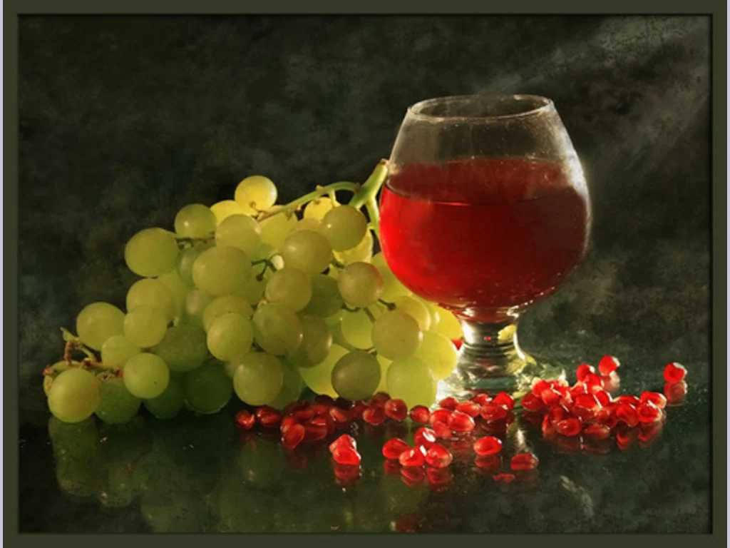 Ключови фрази: Наздравица бяло озряло грозде плодчета нар изпотена чаша червено вино тост приятели