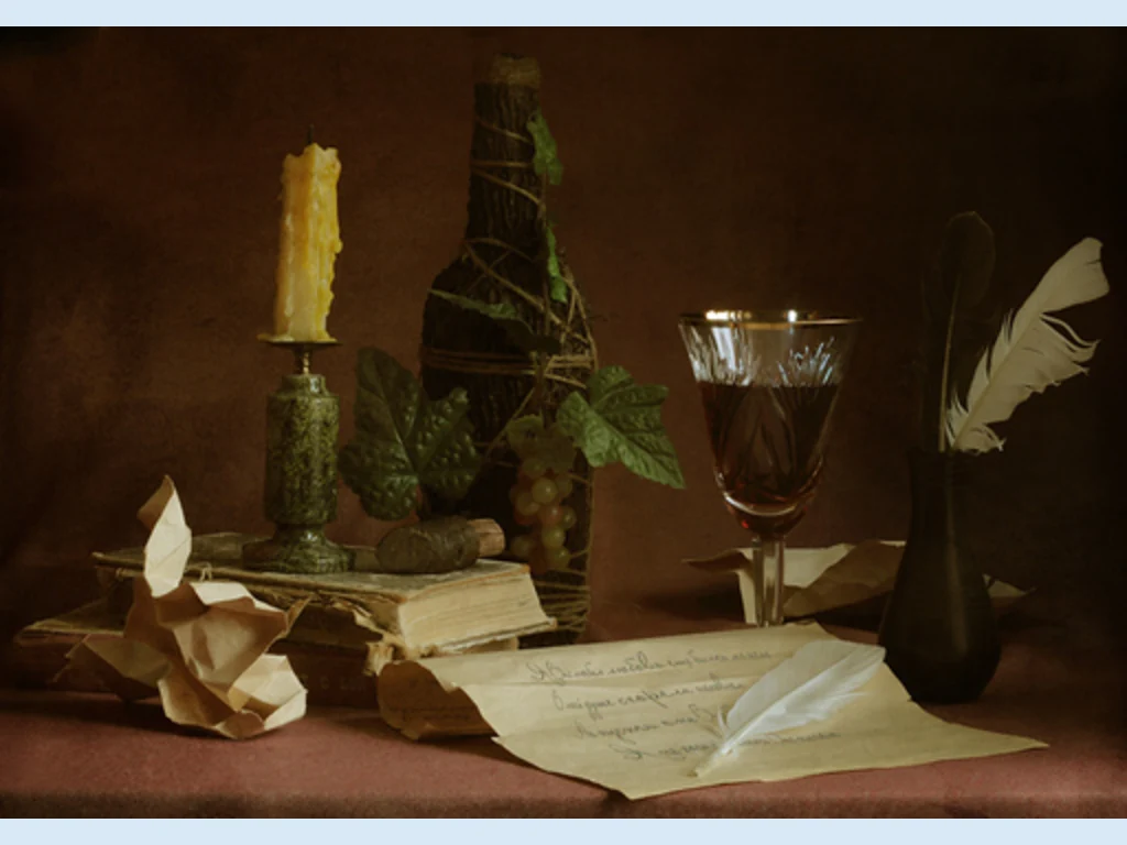 Ключови фрази: Картичка книги свещник бутилка бяло вино чаша кристална писмо мастилница перо писание