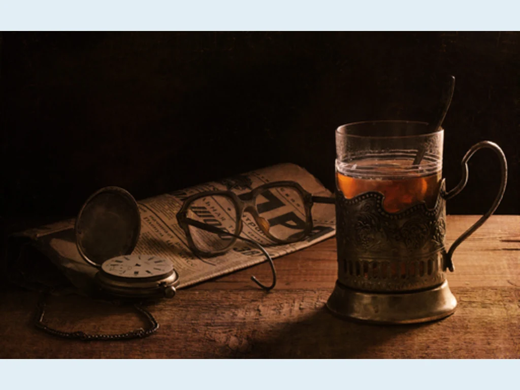 Ключови фрази: Картичка наздравица руски стаканчик чай весник правда очила часовник