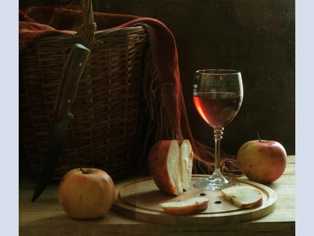 Ключови фрази: Картичка кошница ябълки чаша вино нож наздравица самота