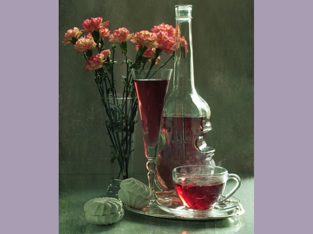 Ключови фрази: Картичка наздравица сребърен поднос карамфили чаша шанпанско чай челувки слаткиши поздрави