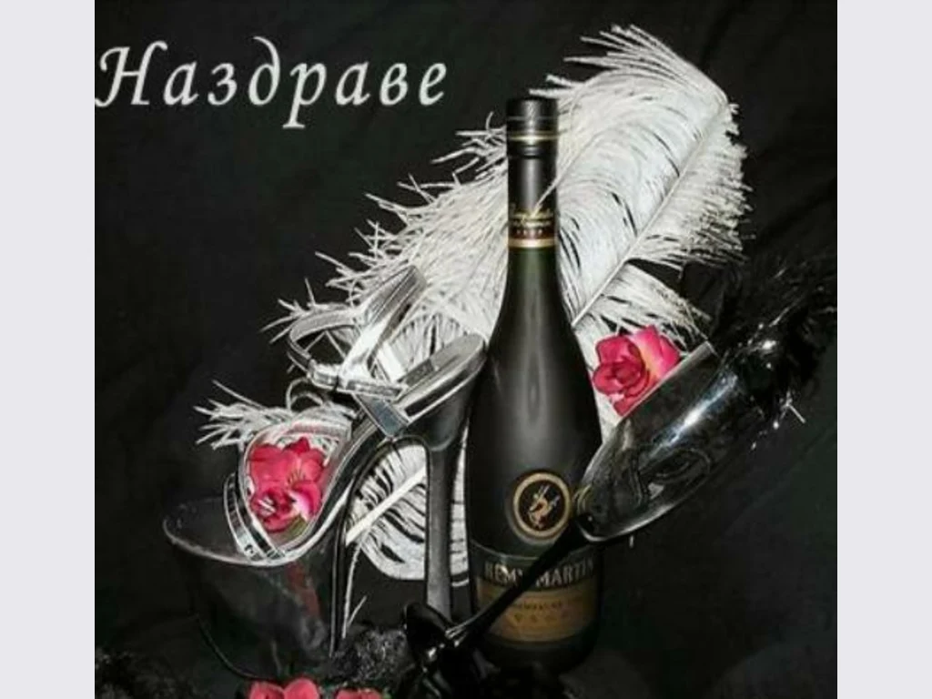 Ключови фрази: Предизвикателна картичка наздравица бутилка мартини сандала сребриста цветя разхвърляни чаша шампанско бели кабаретни пера