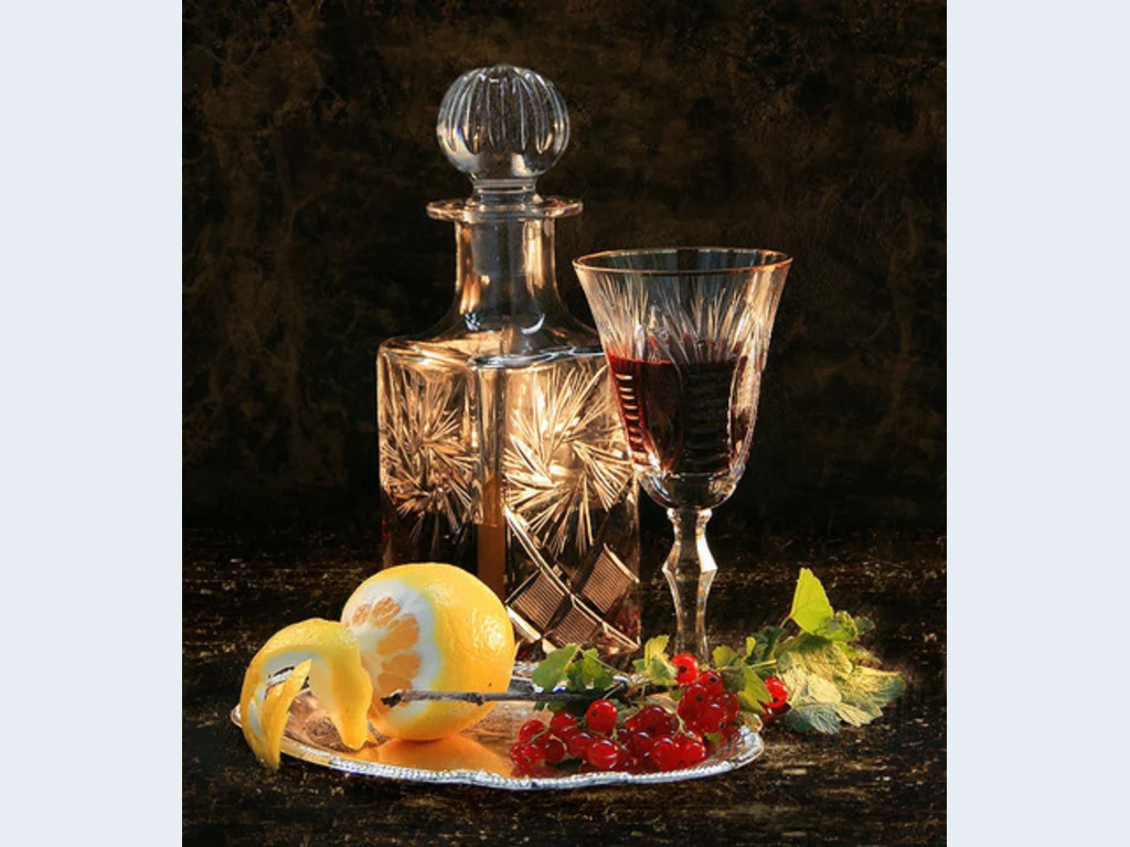 Ключови фрази: Картичка наздравица пожелания тостове приятели стъклена гарафа ром кристална чаша сребърен поднос касис червен лимон