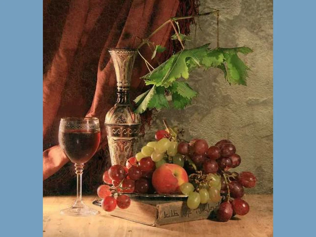 Ключови фрази: Картичка наздравица пожелание здраве истина вино грозде натопена лоза ваза книга сребърен поднос живот