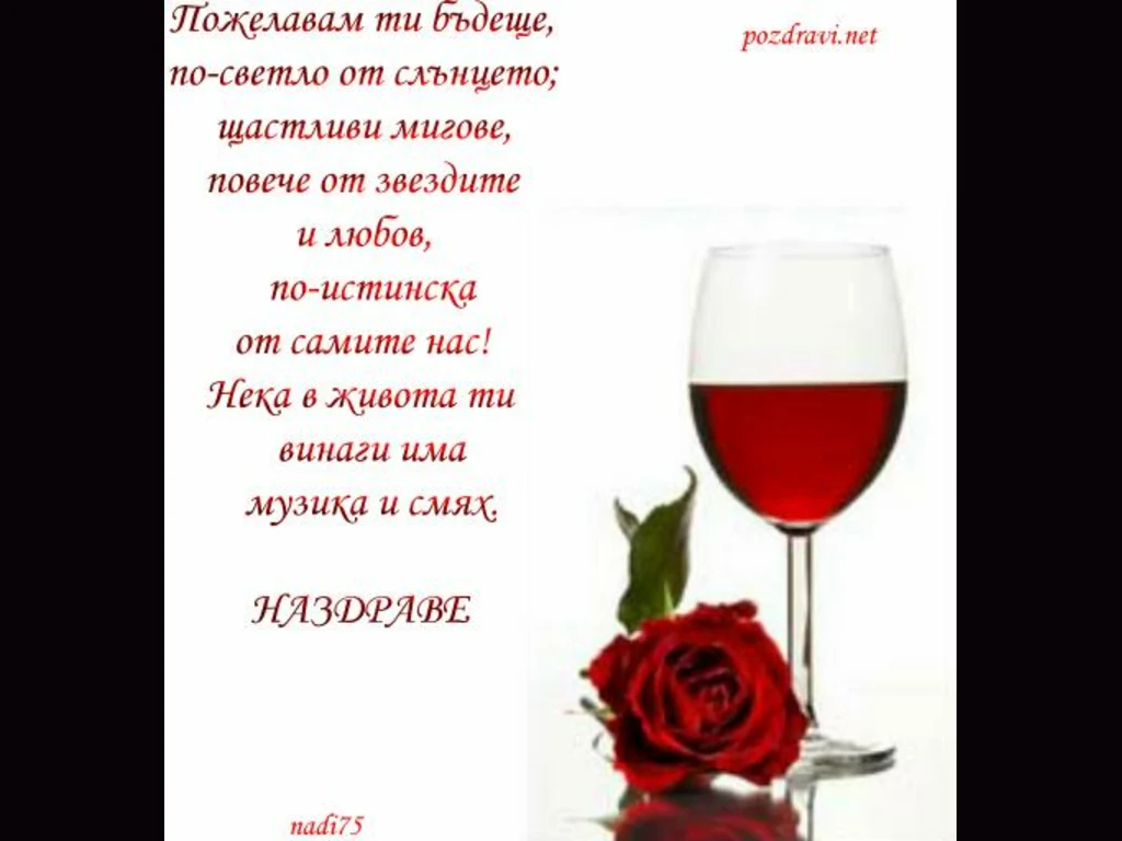 Ключови фрази: Картичка наздравица пожелание поздрави цвете алено червена роза чаша отлежало вино бъдеще слънчево щастие любов музика смях