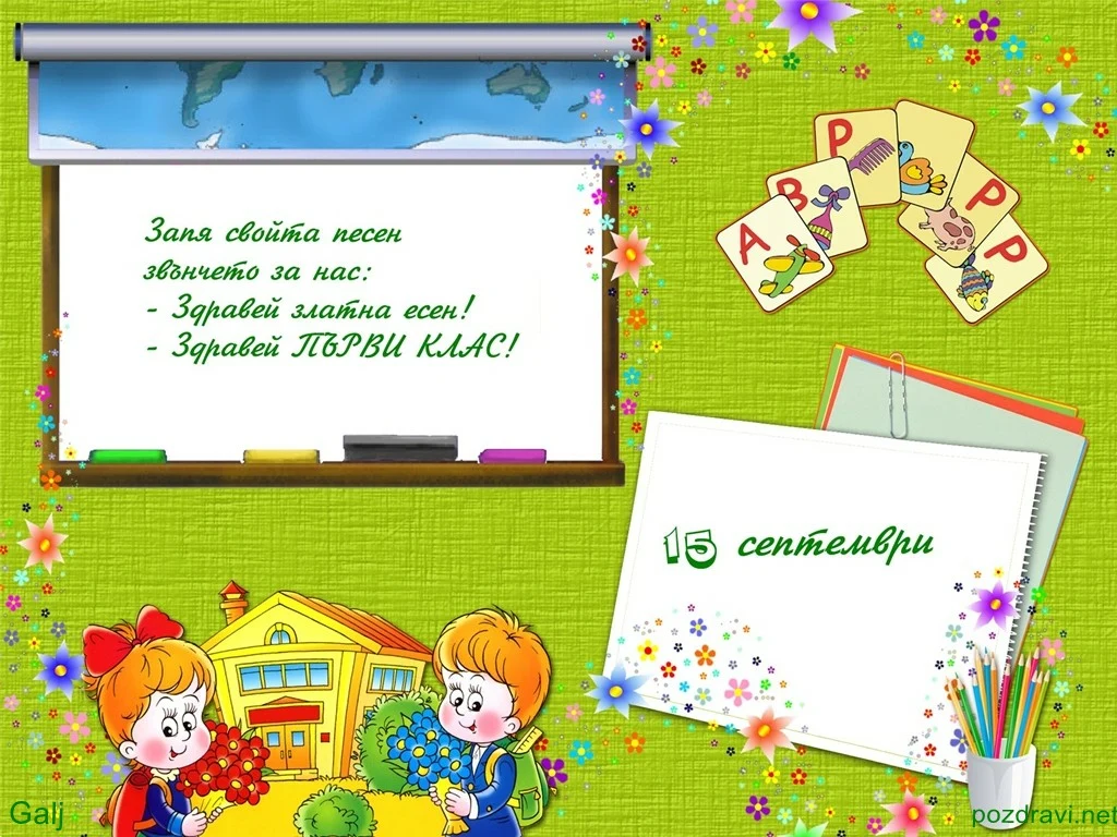 Ключови фрази: картичка пожелание първолак първи учебен ден звънец училище букети дружки премяна усмивки радост