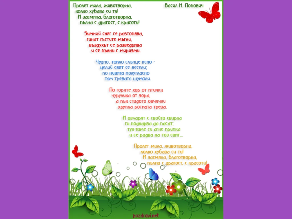 Ключови фрази: Васил Н. Попович Картичка за първа пролет със стихотворение пеперуди цветен текст цветя